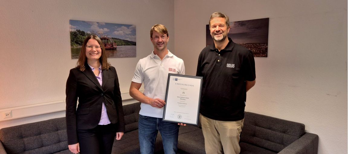 Seit dem Jahr 2000 entwickeln wir effektive Lösungen, die Unternehmen nachhaltig voranbringen. Zuhören und echtes Verstehen der Wünsche und Anforderungen unserer Kunden ist dabei der Schlüssel für erfolgreiche Projekte. Bei einem Treffen am 10.10.2025 in unseren Räumen erhielten wir aus diesem Anlass von Corinna Schreck – Vorstands-Referentin und Rechtsanwältin der IHK Würzburg-Schweinfurt – eine entsprechende Jubiläums-Urkunde.